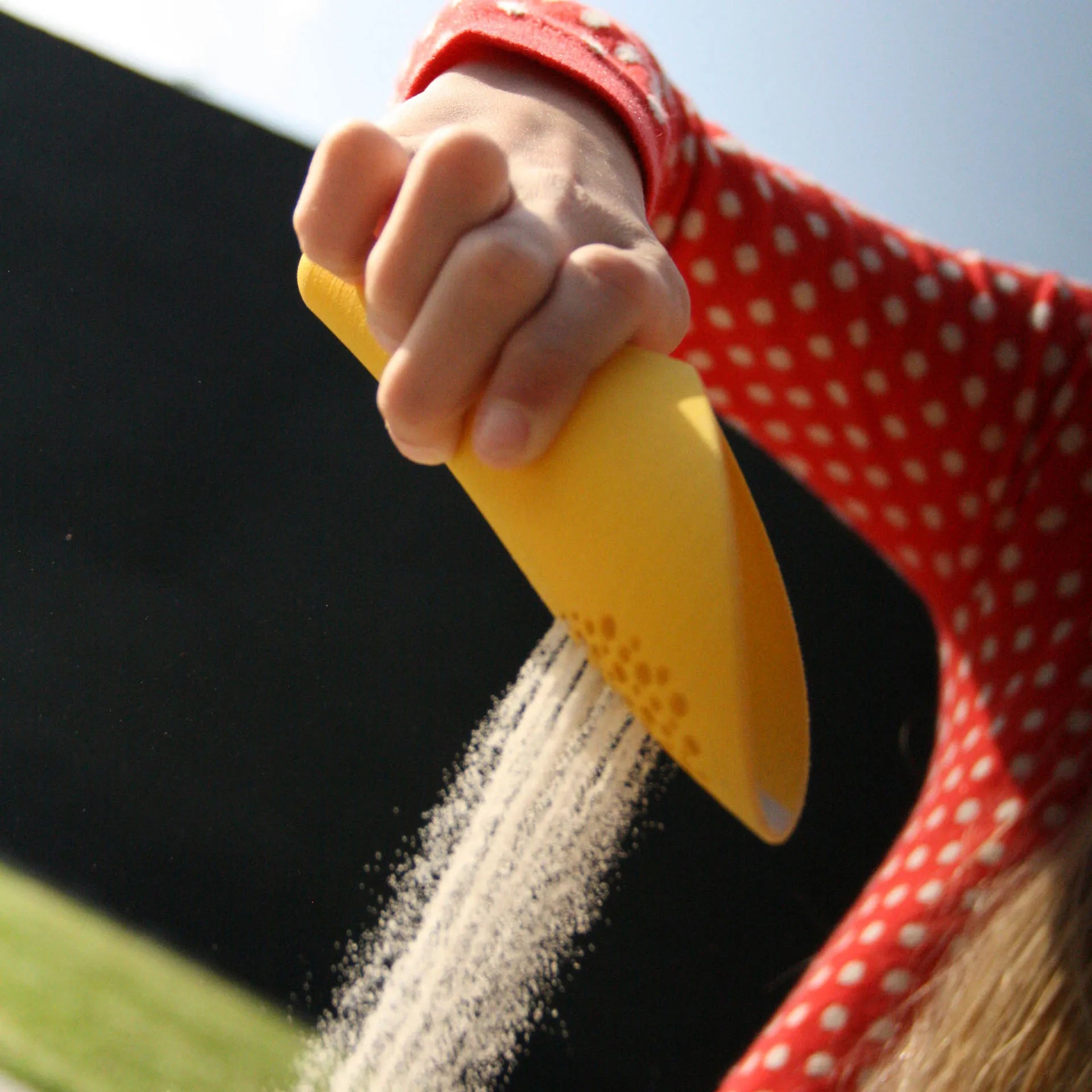 Use the shovel to scoop out sand and make tracks for rolling the ball or use the uniquely designed hole to write or make patterns with sand and water.