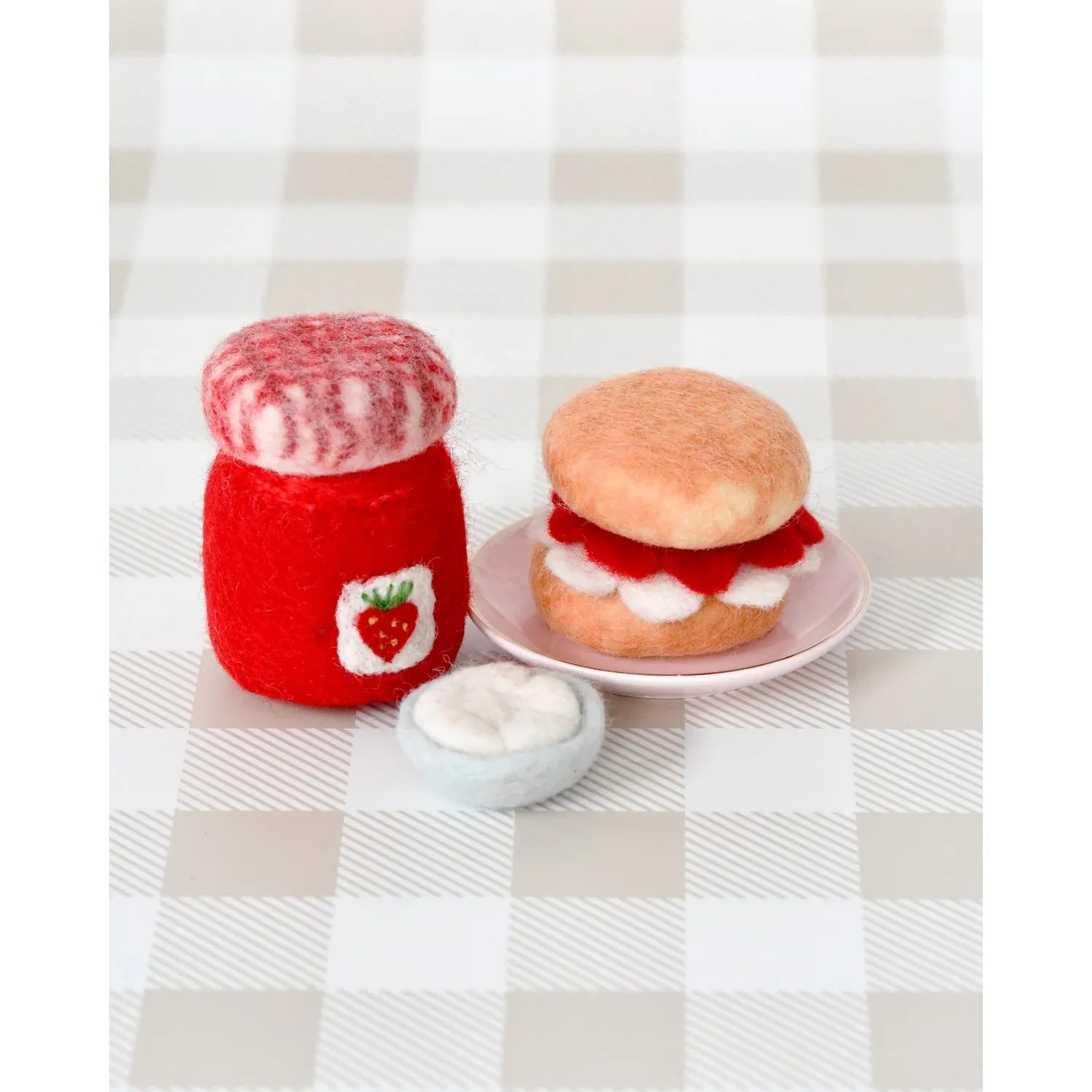 Each scone comes apart into a top and bottom half, ready to be layered with soft felt cream and a generous helping of jam. A dish of fluffy cream completes the set, inviting your child to build and serve their own delightful scone creations, over and over again.