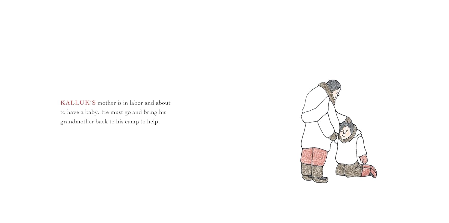 On the trip back, Kalluk and his grandmother talk about happiness, peace and choices. They speak to the ravens and get a lift from the wind right to Kalluk's doorstep. And waiting inside is a new baby sister! Holding her in his arms, Kalluk discovers a new reason to be thankful.