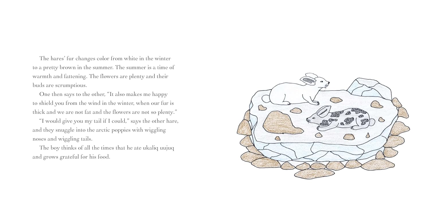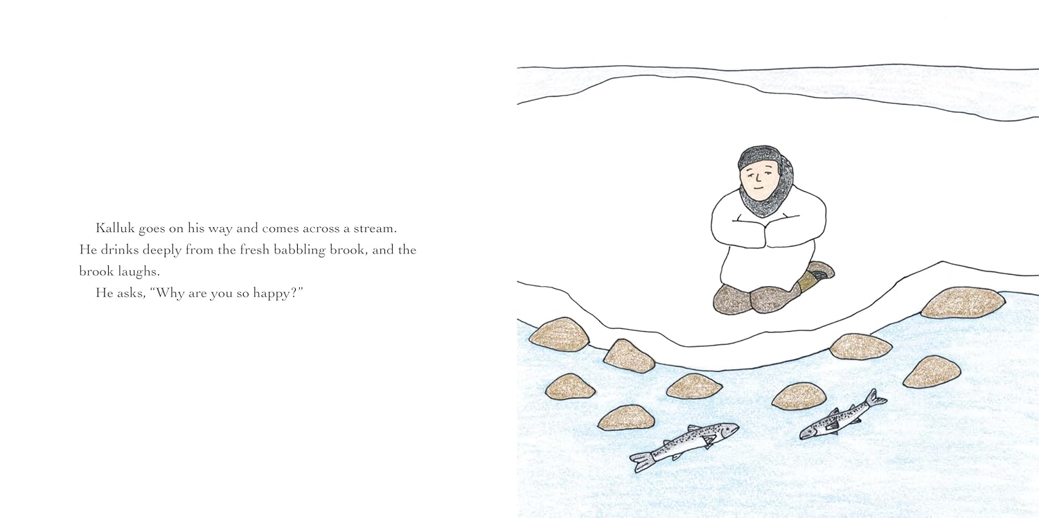 A young boy, Kalluk, leaves his camp to tell his grandmother that his mother is about to have a baby. Along the way, Kalluk meets different animals and he asks them why they are so happy. The rabbits say they love to be fast enough to outrun the fox and clever enough to know when to hide. They are happy to protect each other from the winter wind: "I'd give you my tail if I could!" they say. A mother fox tells the boy her pups make her happy (and her pups say their mother makes them happy: "We would give her our tails if we could!" they say. Even the river and the wind have reasons to be happy. Kalluk's encounters with nature make him reflect on his gratitude for all it provides.