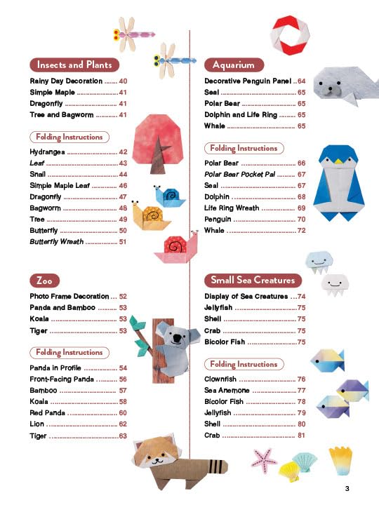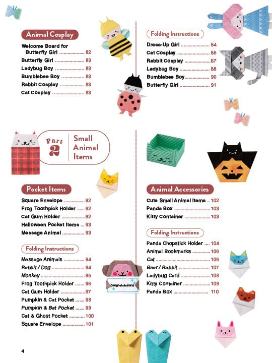 The following are just some of the unique origami models you'll enjoy making with this book:Adorably cute animals—several types of dogs, cats, rabbits and hamsters—plus a chibi owl!Zoo favorites like lions and tigers, pandas with bamboo, and koalas with eucalyptusDolphins, seals and penguins—plus a "Nemo" clownfish folded from a single sheet!Lifelike flowers and butterflies that can be combined to form a decorative wreath!Greeting cards, envelopes, boxes and accessories you can use to hold candies or send messages to friendsCute animal dolls like a Butterfly Girl, a Ladybug Boy and clever cat and rabbit "furries!"Seasonal wall decorations for each month of the year featuring cherry blossoms, dragonflies and maple leavesAnd much more!