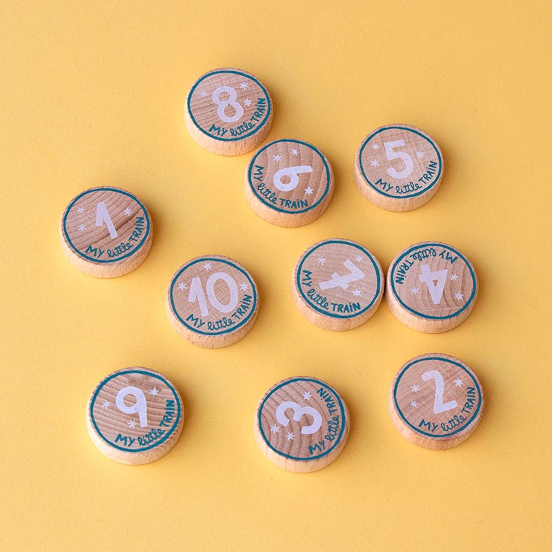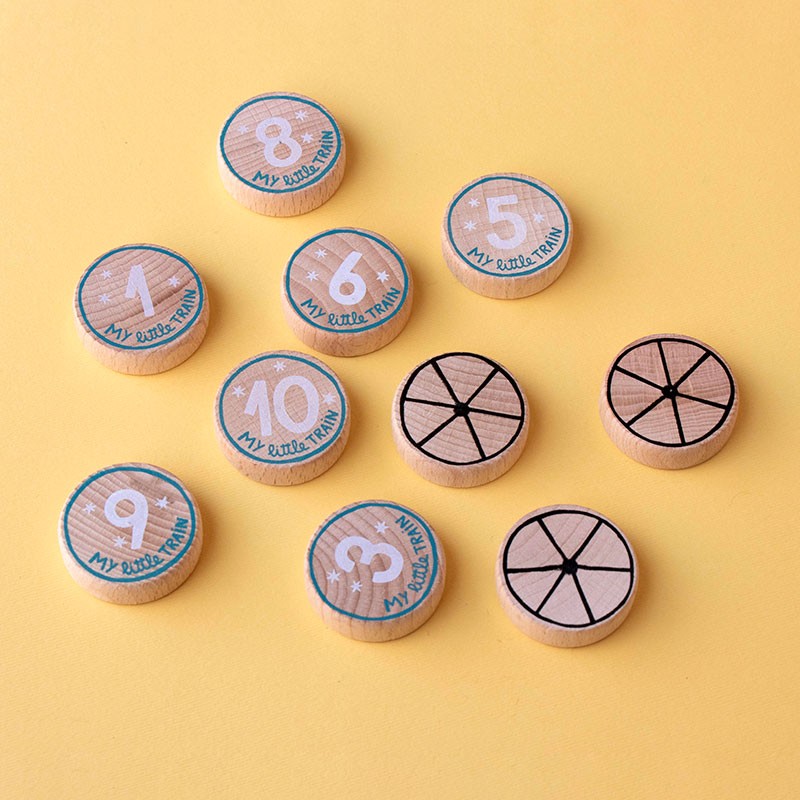 Ten 3-piece puzzles in the shape of train carriages with a wooden piece that fits into each one. Helps small children learn to count from 1 to 10 in a fun way.