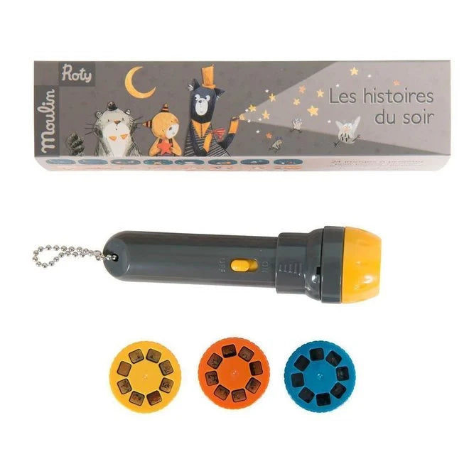 A pocket torch/flashlight where each of the discs tells a tale when projected on the wall (no words, photos only!). Coloured, delicate illustrations transport children to an imaginary, enchanted world.