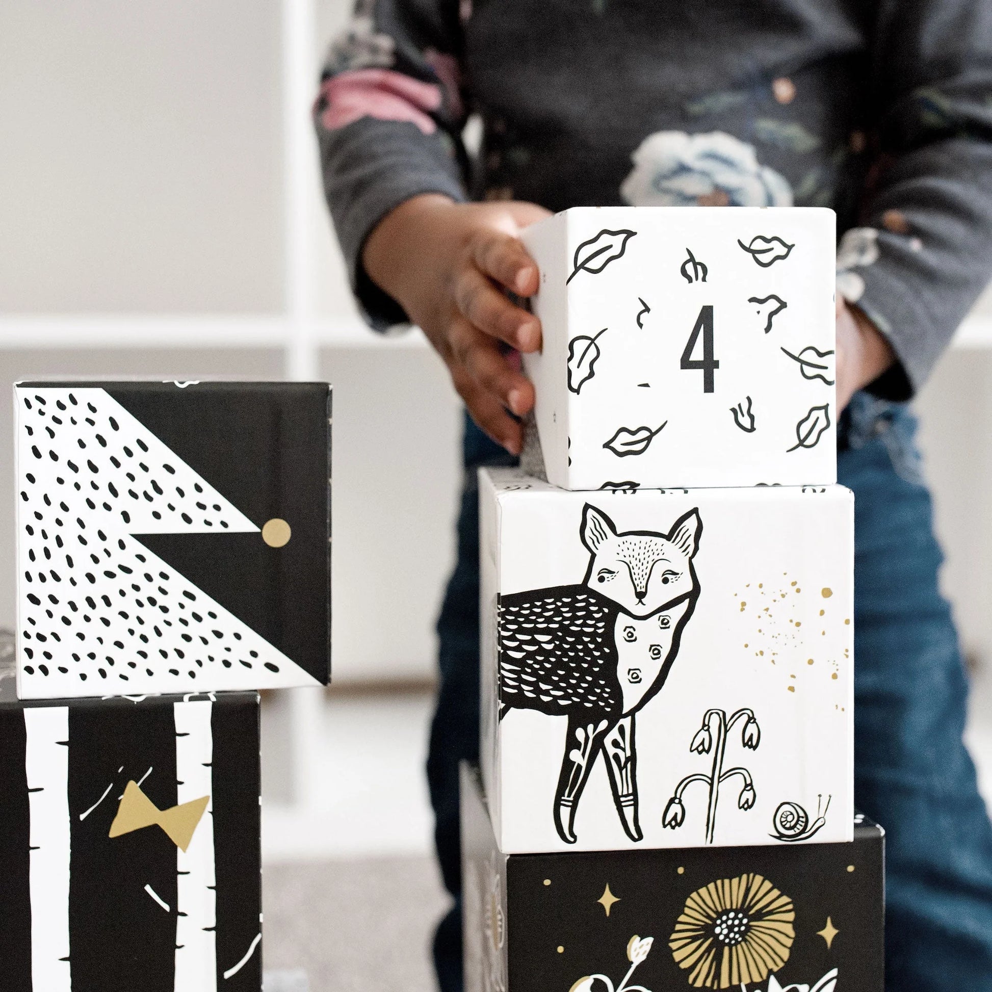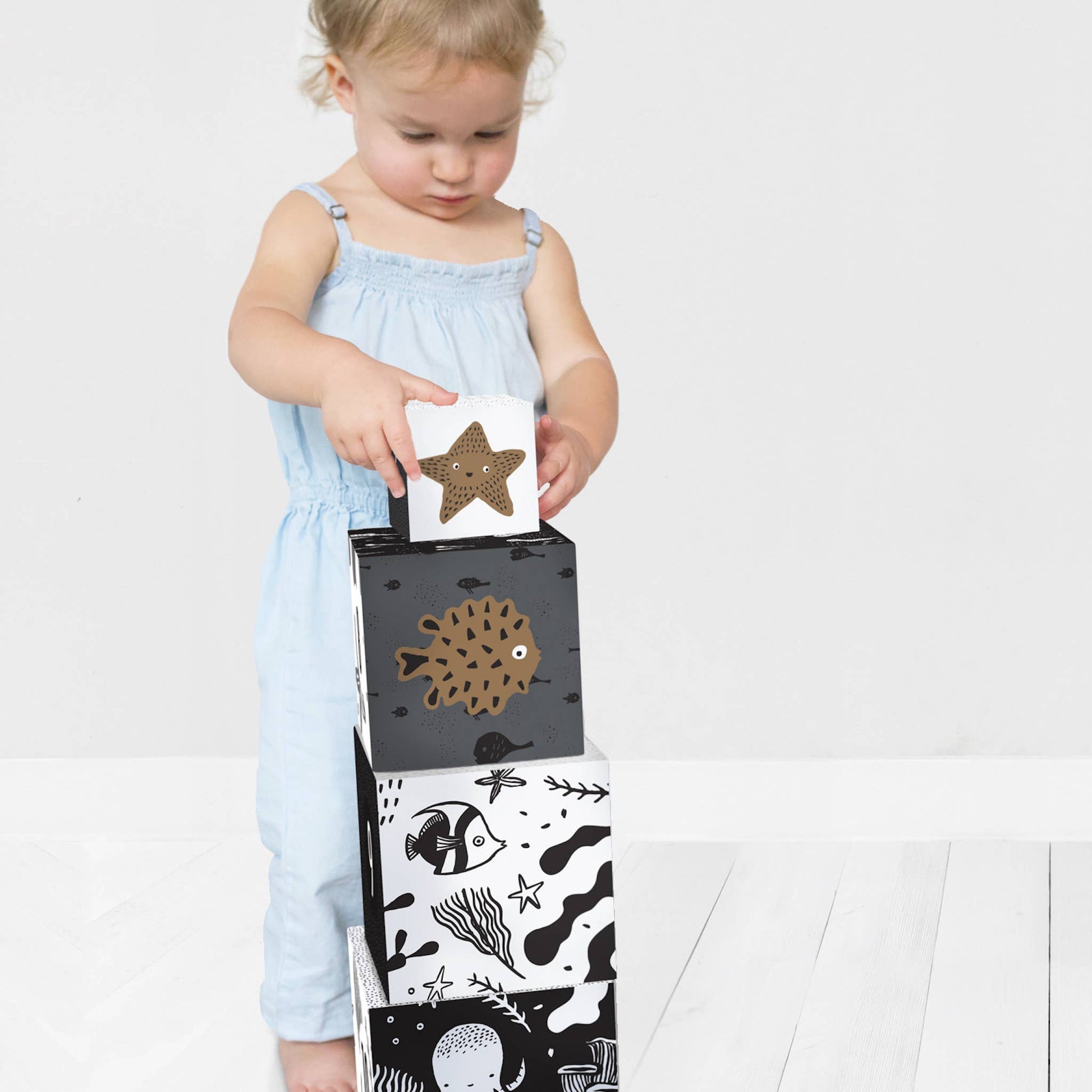 Let your imagination run wild with these whimsical animal blocks. Stack and play all day, explore numbers and counting all while enjoying the high-contrast patterns and illustrations.