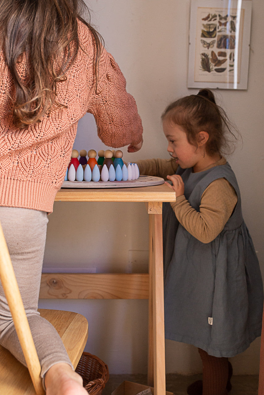 Grapat's Mandala collection invites children to create mandalas, individually or in a collective. They can also be used to create pictures and representations. Mandala sets include 36 pieces in order to make round creations. Depending on the needs of the kids, they can enrich symbolic play, they can be used as food for cooking or elements to transport. When the children are older and in the phase of concrete learning, the Mandala pieces can be used for counting, lining up, or creating letters among many other things.